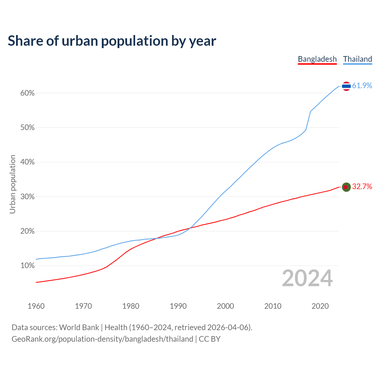 From 2004 to 2024, the share of urban population changed from 25% to 32.7% in Bangladesh and from 36.8% to 61.9% in Thailand.