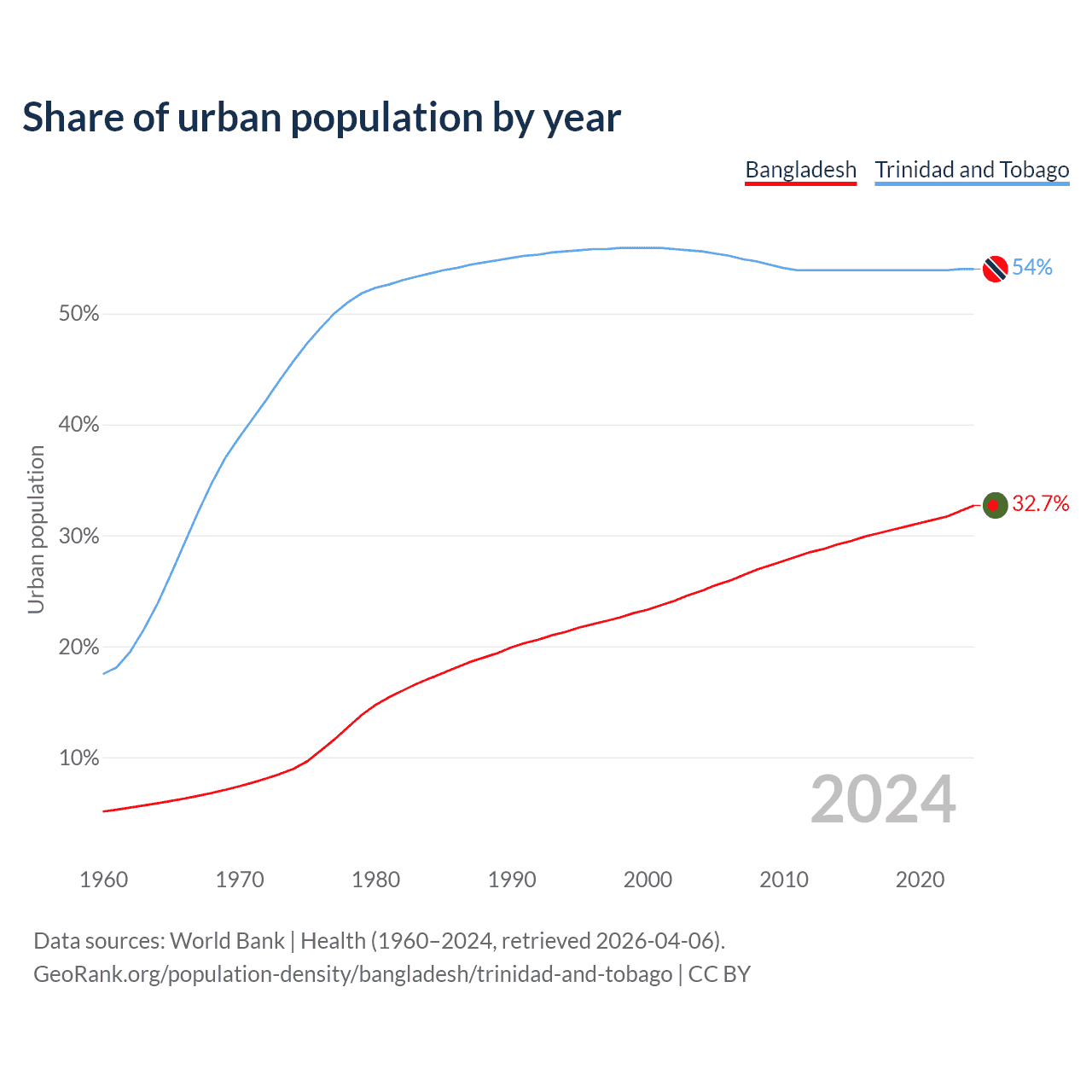 From 2004 to 2024, the share of urban population changed from 25% to 32.7% in Bangladesh and from 55.6% to 54% in Trinidad and Tobago.