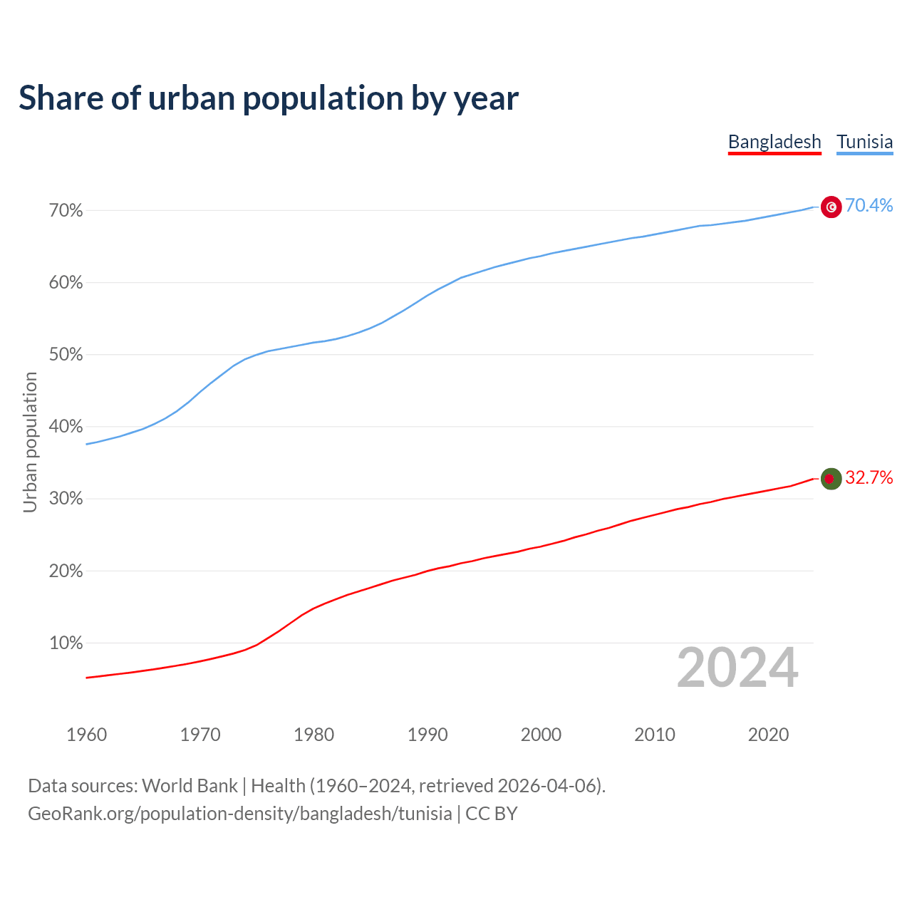 From 2004 to 2024, the share of urban population changed from 25% to 32.7% in Bangladesh and from 64.9% to 70.4% in Tunisia.