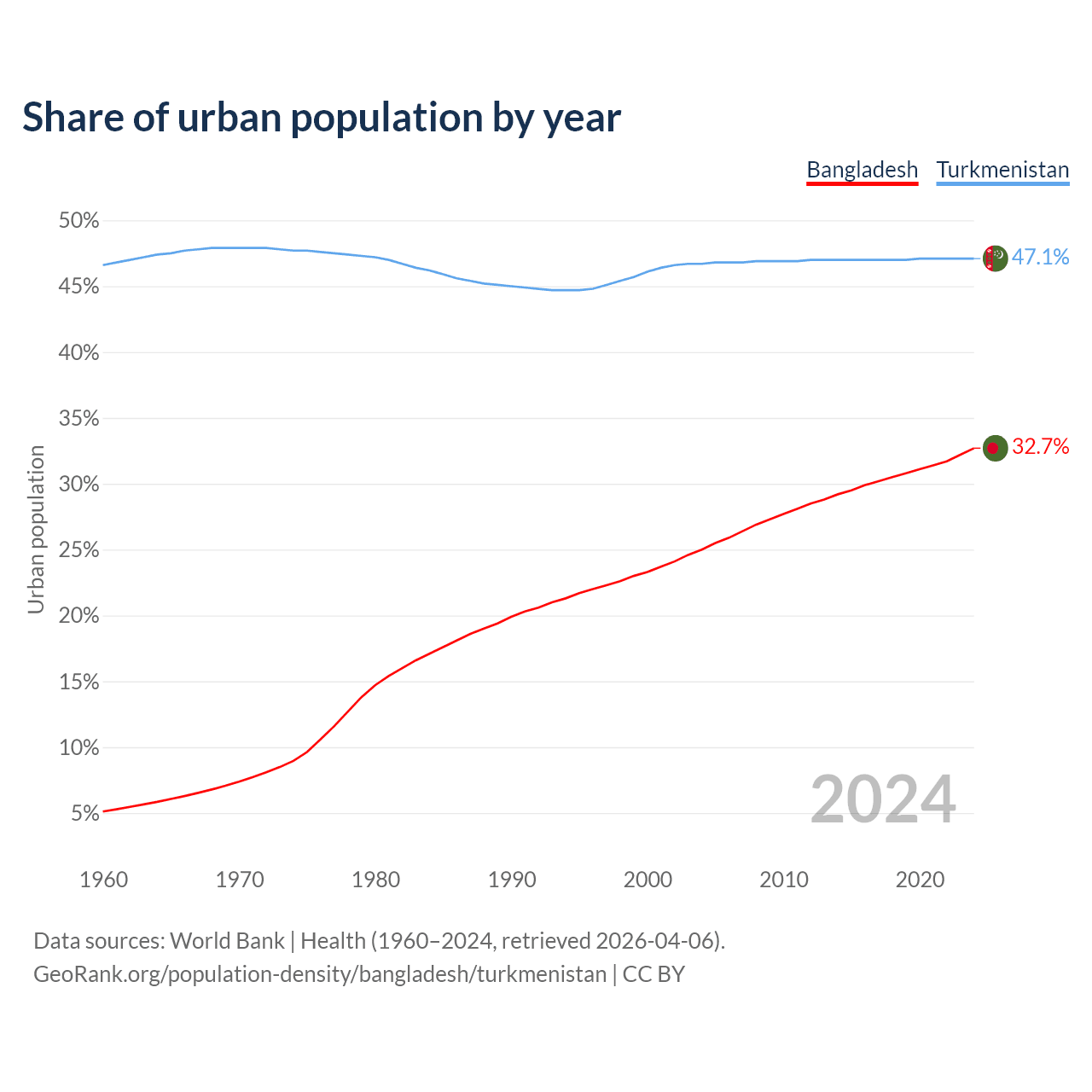From 2004 to 2024, the share of urban population changed from 25% to 32.7% in Bangladesh and from 46.7% to 47.1% in Turkmenistan.