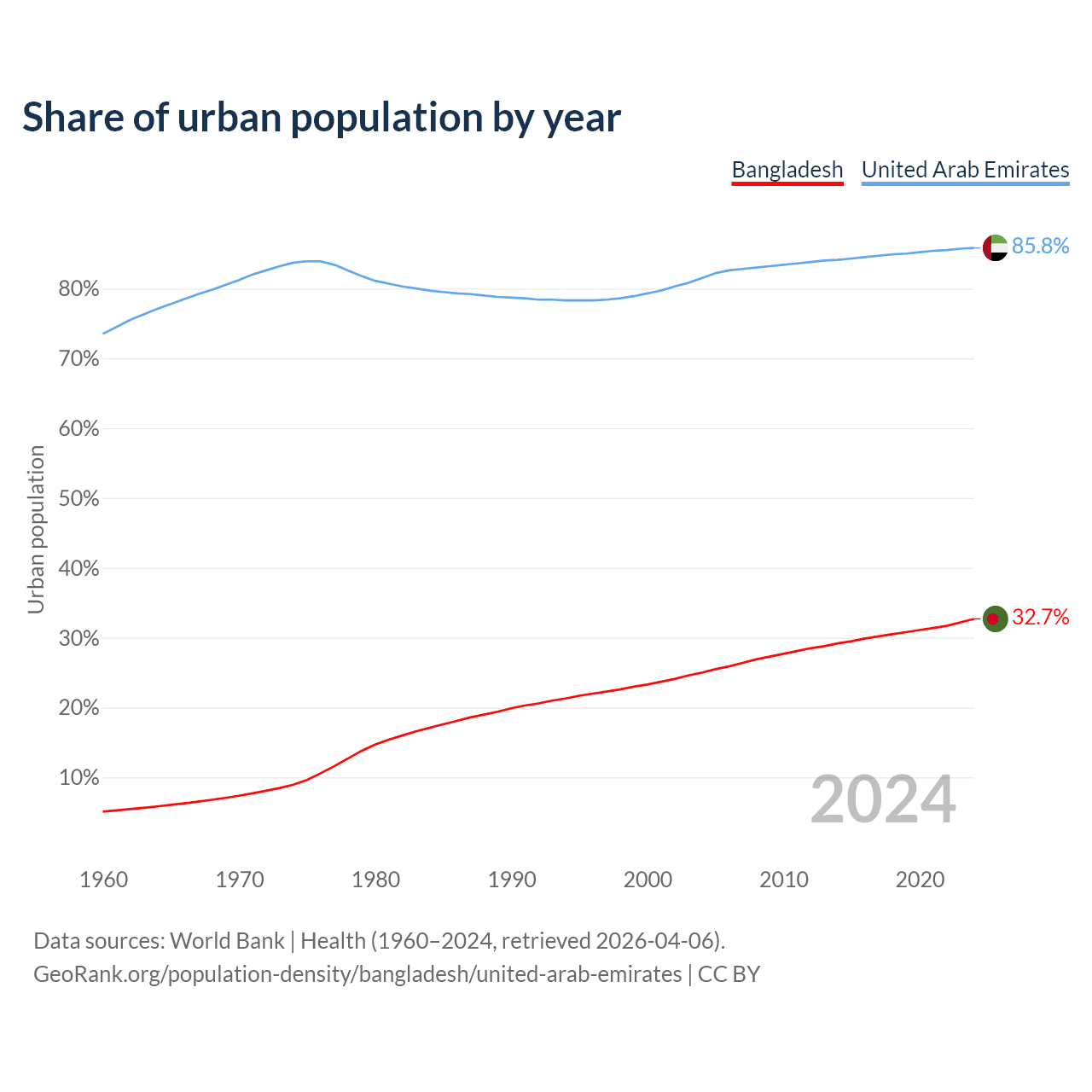 From 2004 to 2024, the share of urban population changed from 25% to 32.7% in Bangladesh and from 81.5% to 85.8% in the United Arab Emirates.