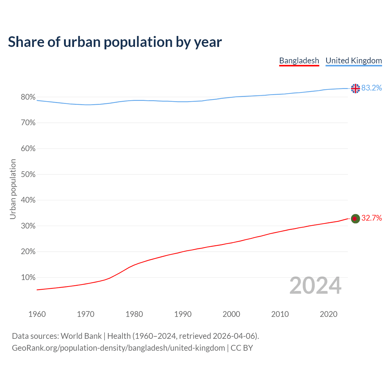 From 2004 to 2024, the share of urban population changed from 25% to 32.7% in Bangladesh and from 80.3% to 83.2% in the United Kingdom.