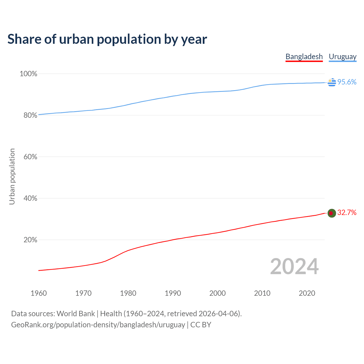 From 2004 to 2024, the share of urban population changed from 25% to 32.7% in Bangladesh and from 91.8% to 95.6% in Uruguay.