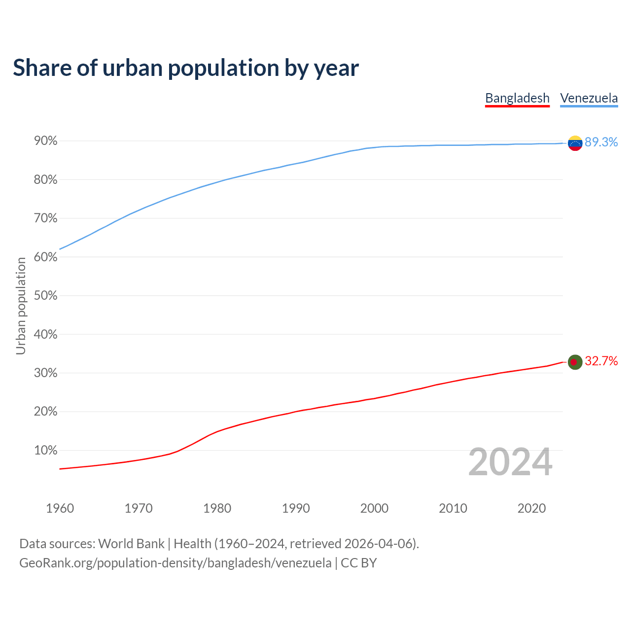 From 2004 to 2024, the share of urban population changed from 25% to 32.7% in Bangladesh and from 88.6% to 89.3% in Venezuela.