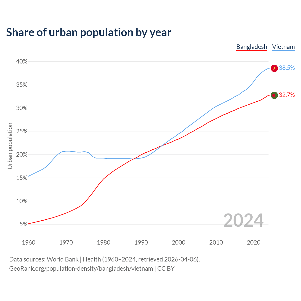 From 2004 to 2024, the share of urban population changed from 25% to 32.7% in Bangladesh and from 26.8% to 38.5% in Vietnam.