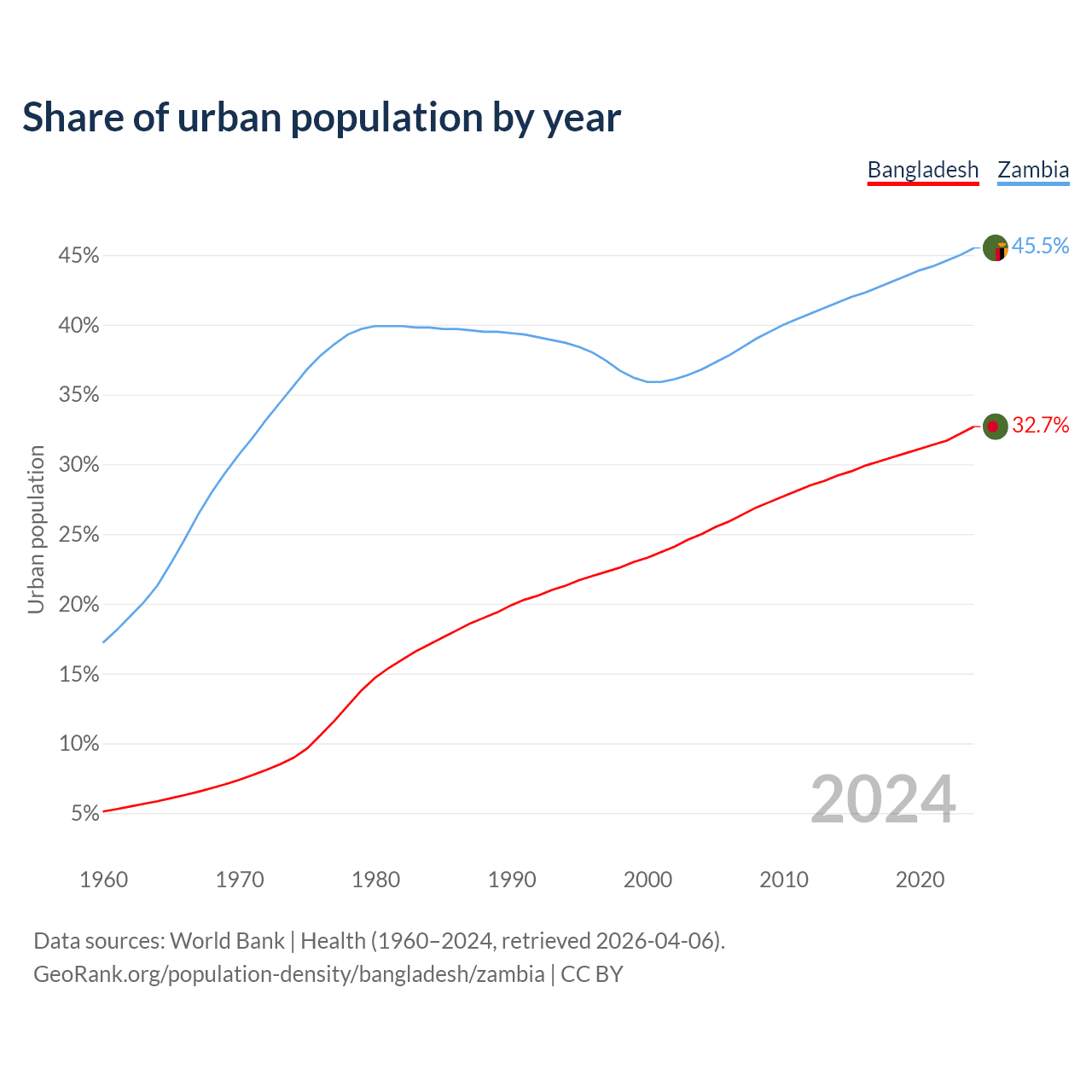 From 2004 to 2024, the share of urban population changed from 25% to 32.7% in Bangladesh and from 36.8% to 45.5% in Zambia.