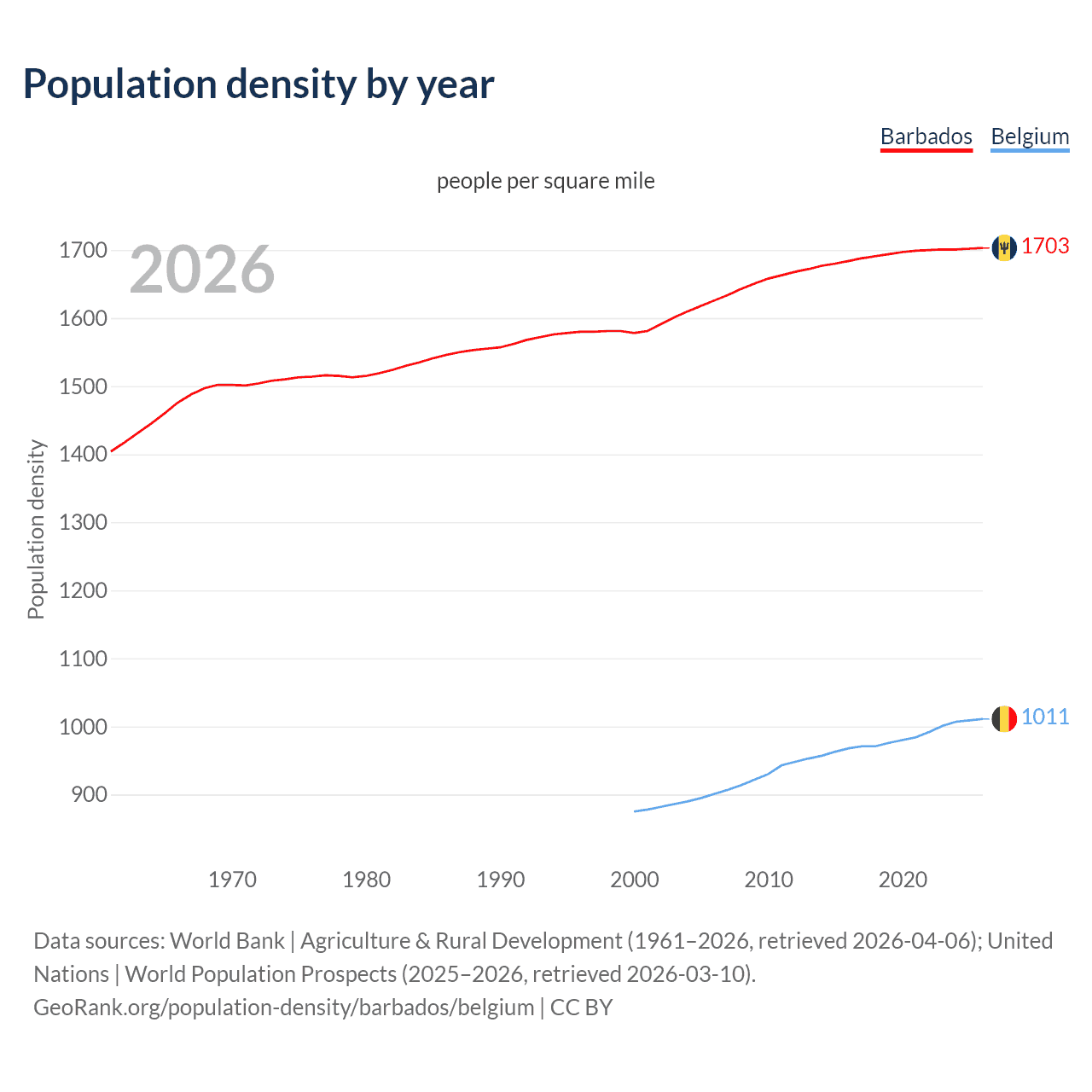 From 2006 to 2026, population density in Barbados increased by 4.73%, compared to a 12.2% growth in Belgium.