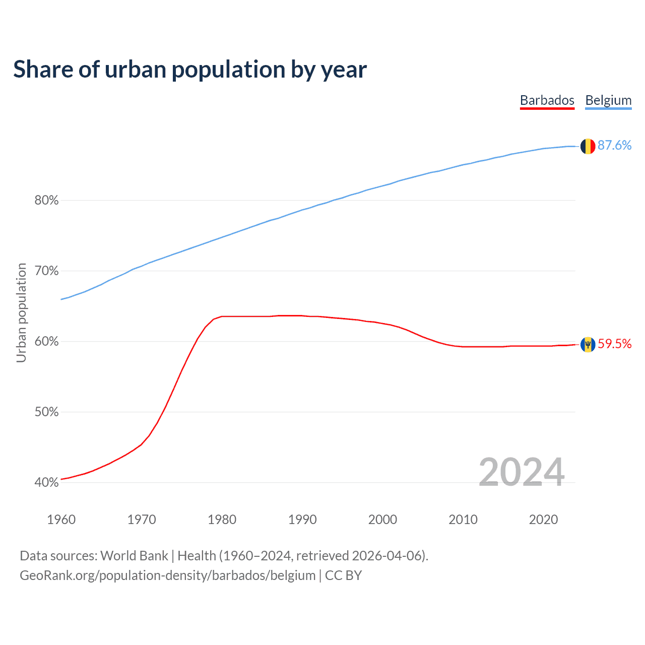 From 2004 to 2024, the share of urban population changed from 61.1% to 59.5% in Barbados and from 83.3% to 87.6% in Belgium.