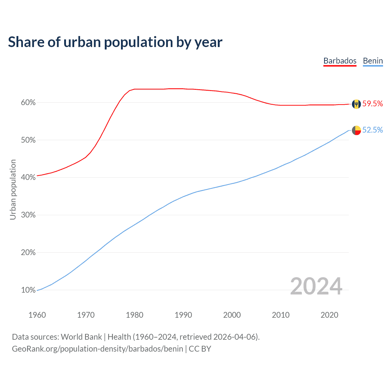 From 2004 to 2024, the share of urban population changed from 61.1% to 59.5% in Barbados and from 39.9% to 52.5% in Benin.