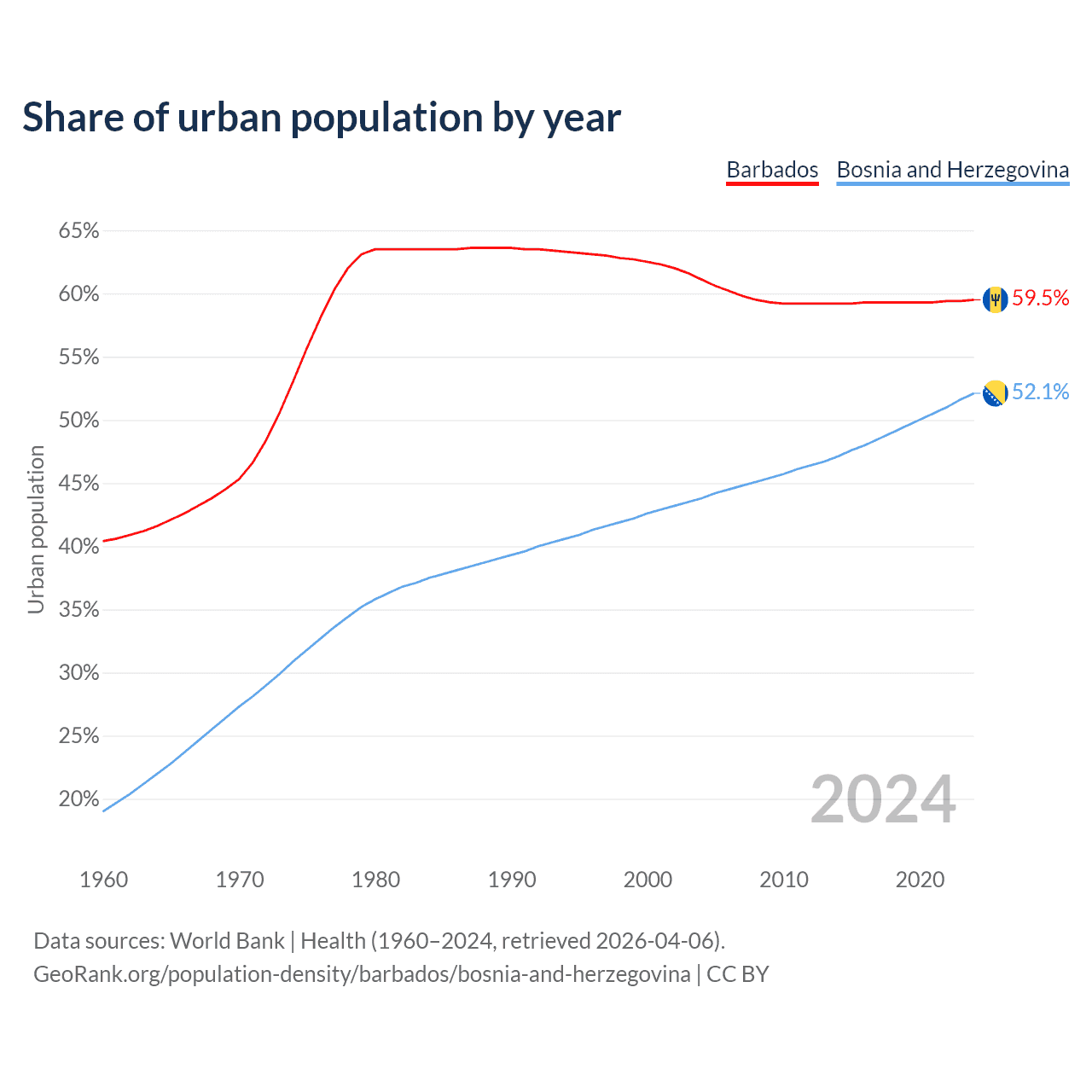 From 2004 to 2024, the share of urban population changed from 61.1% to 59.5% in Barbados and from 43.8% to 52.1% in Bosnia and Herzegovina.