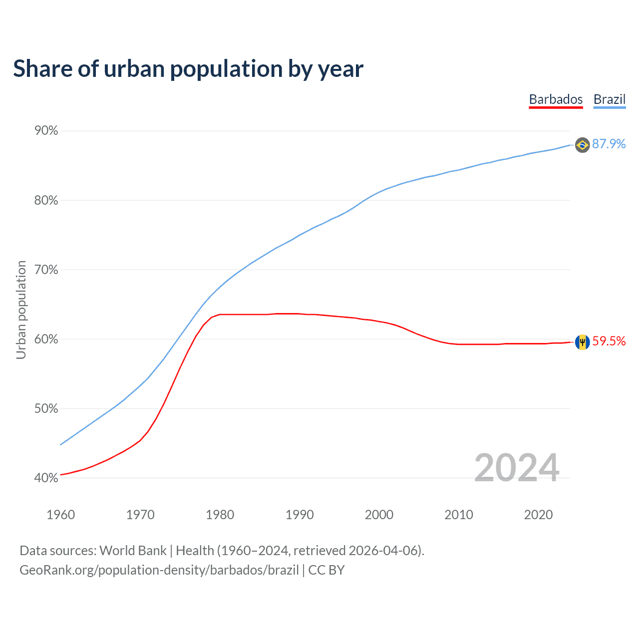 From 2004 to 2024, the share of urban population changed from 61.1% to 59.5% in Barbados and from 82.7% to 87.9% in Brazil.