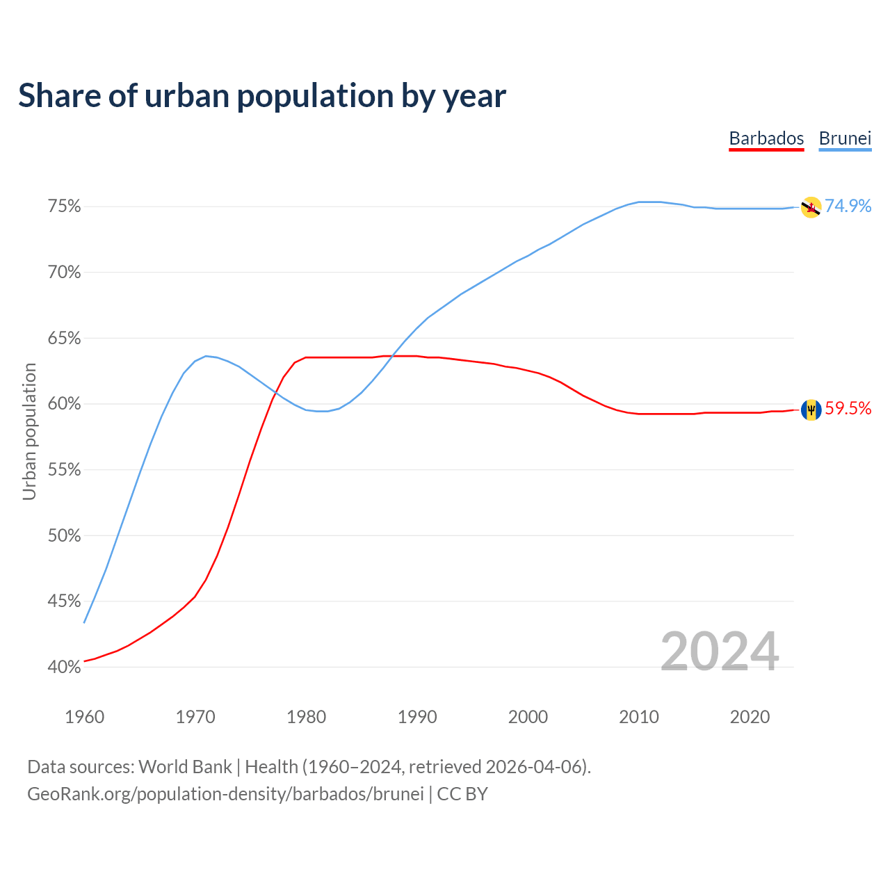 From 2004 to 2024, the share of urban population changed from 61.1% to 59.5% in Barbados and from 73.1% to 74.9% in Brunei.