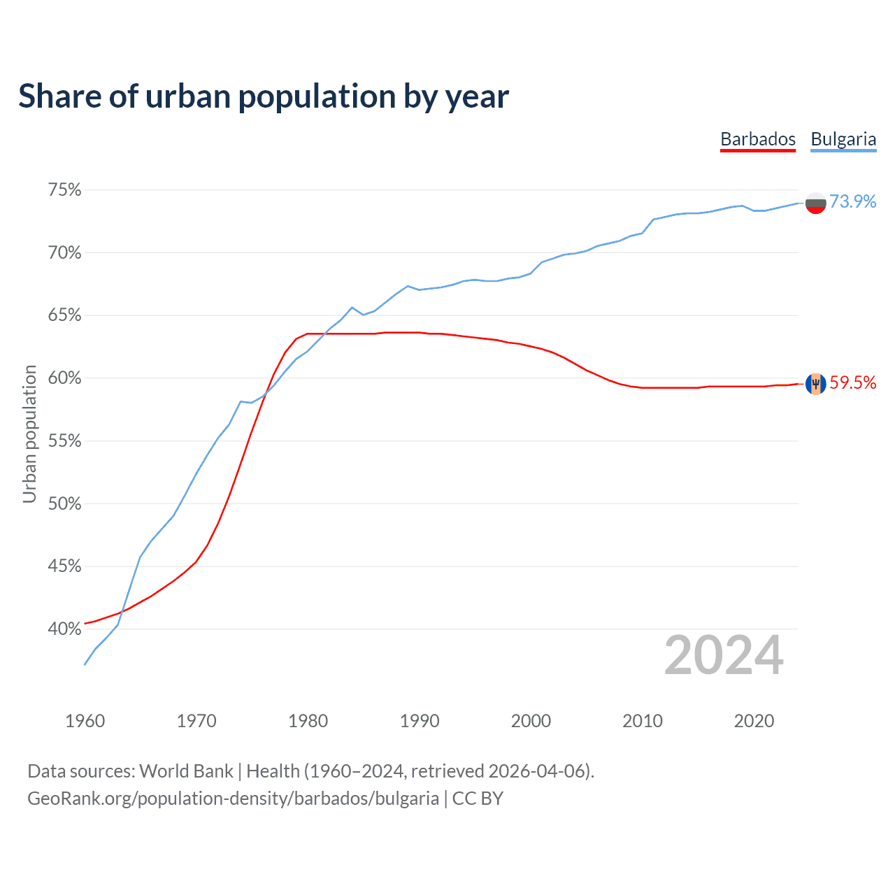 From 2004 to 2024, the share of urban population changed from 61.1% to 59.5% in Barbados and from 69.9% to 73.9% in Bulgaria.