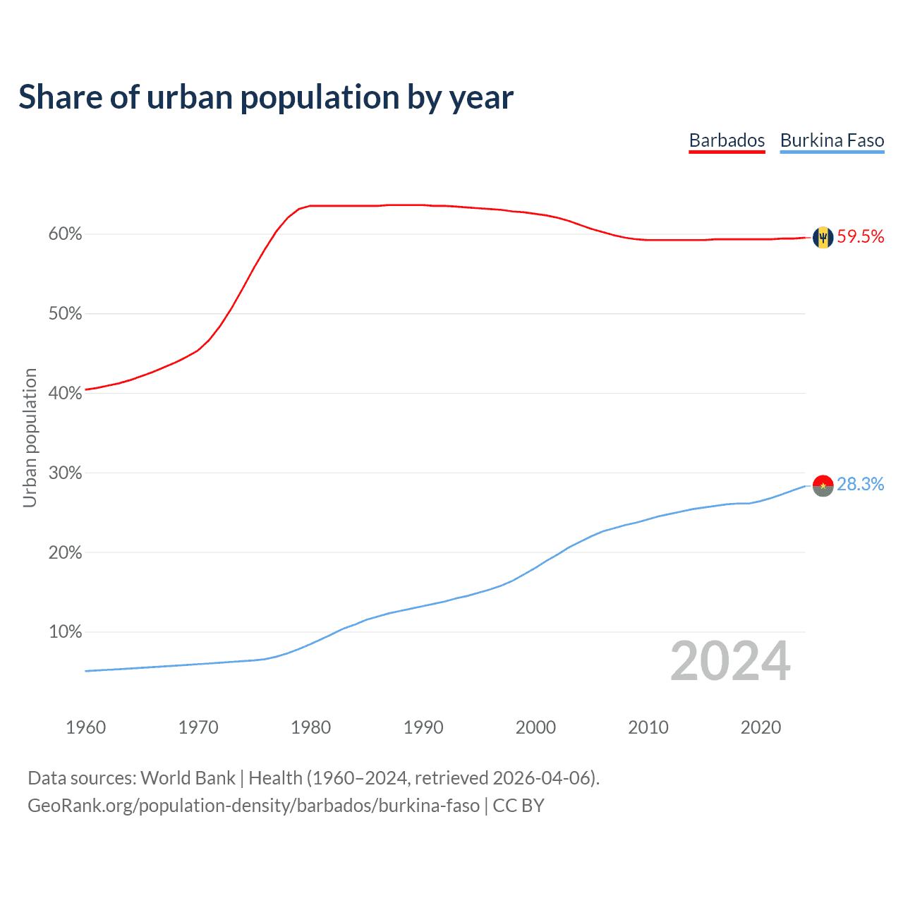 From 2004 to 2024, the share of urban population changed from 61.1% to 59.5% in Barbados and from 21.3% to 28.3% in Burkina Faso.