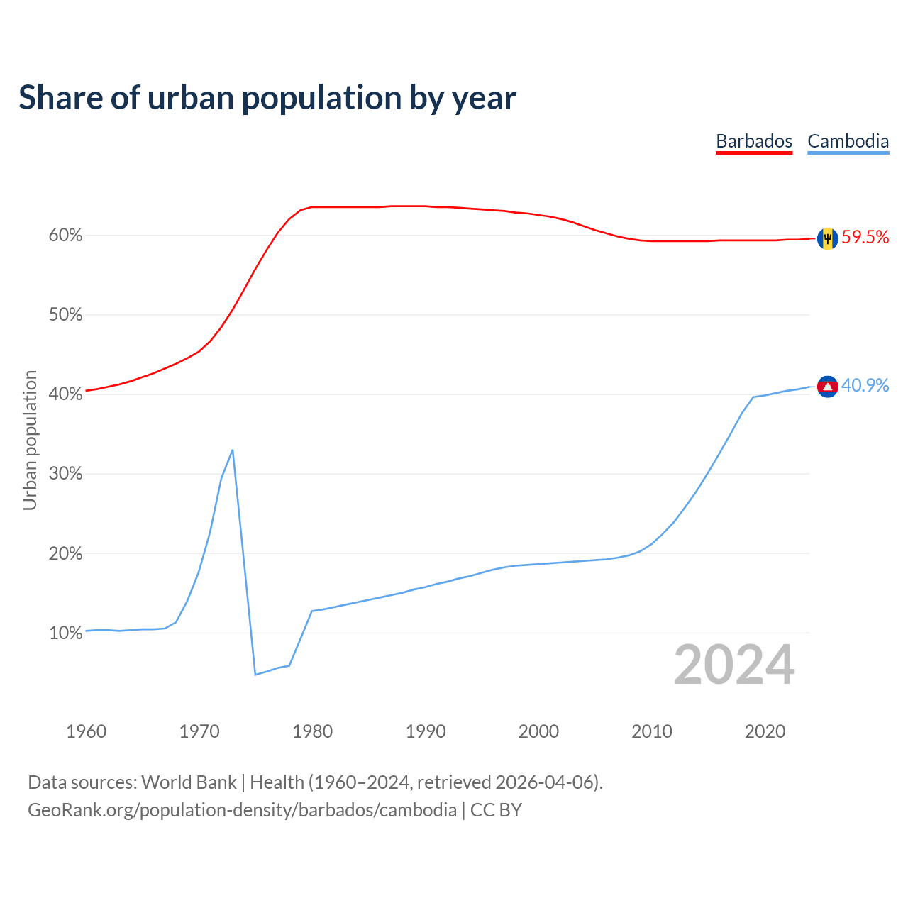 From 2004 to 2024, the share of urban population changed from 61.1% to 59.5% in Barbados and from 19% to 40.9% in Cambodia.