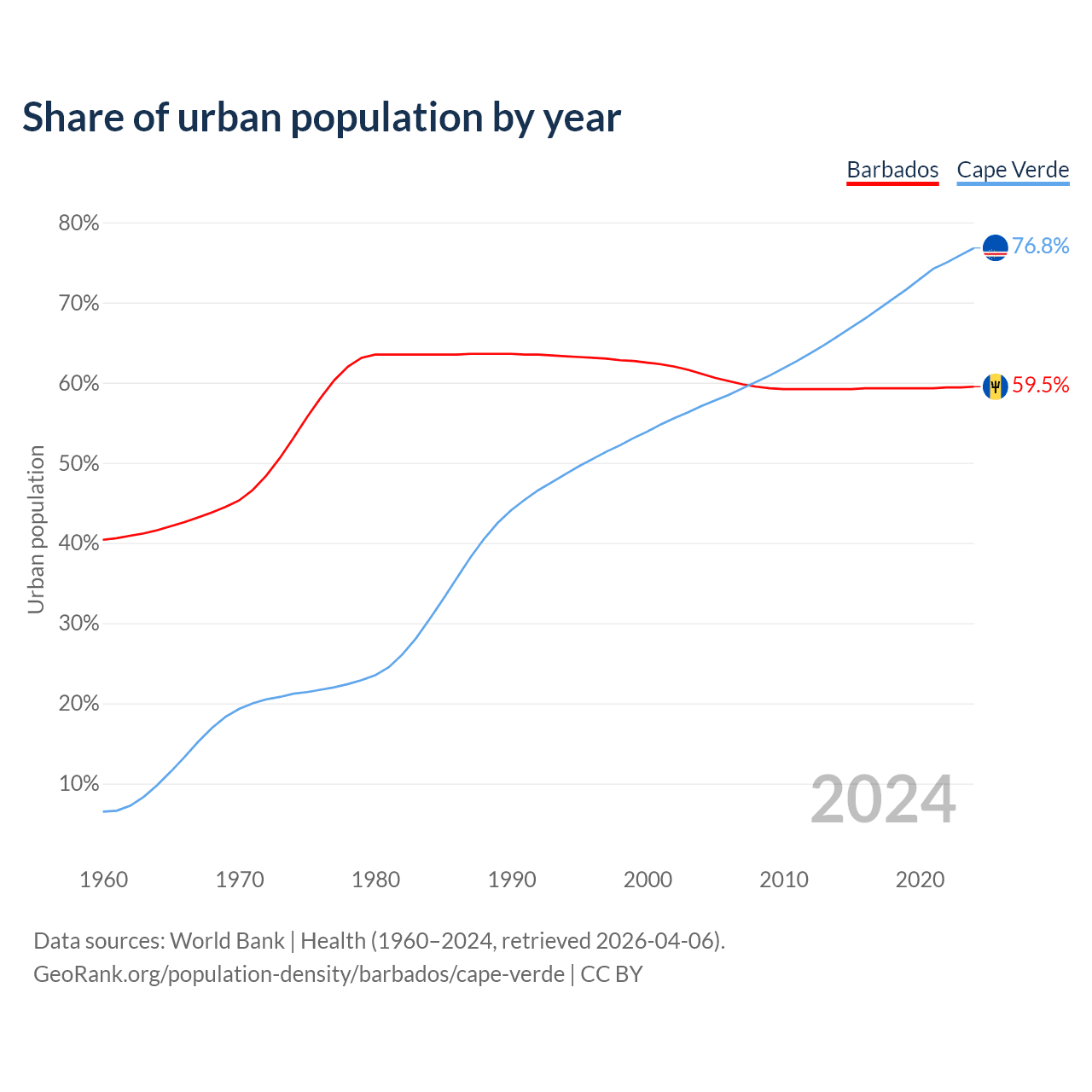 From 2004 to 2024, the share of urban population changed from 61.1% to 59.5% in Barbados and from 57.1% to 76.8% in Cape Verde.