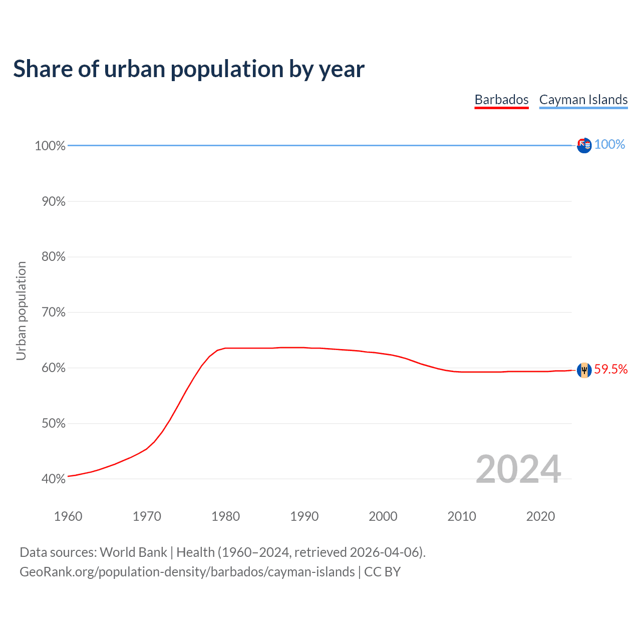 From 2004 to 2024, the share of urban population changed from 61.1% to 59.5% in Barbados and from 100% to 100% in the Cayman Islands.