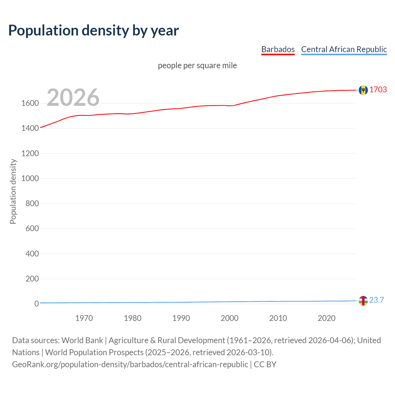 From 2006 to 2026, population density in Barbados increased by 4.73%, compared to a 30.3% growth in the Central African Republic.