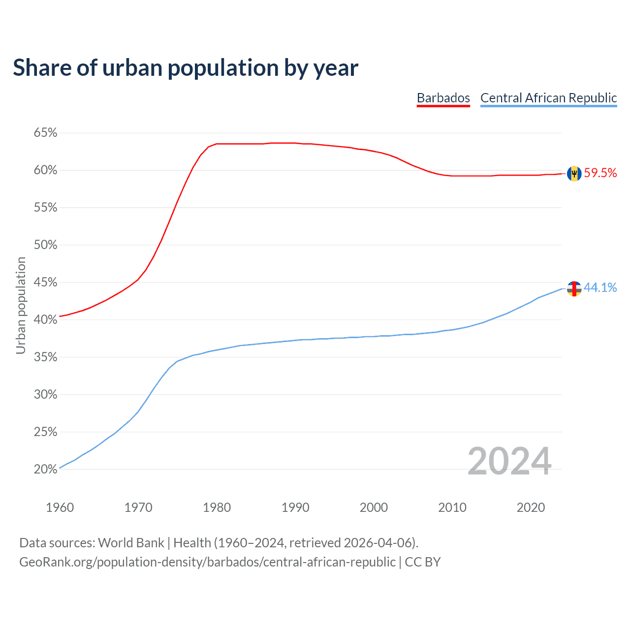 From 2004 to 2024, the share of urban population changed from 61.1% to 59.5% in Barbados and from 38% to 44.1% in the Central African Republic.