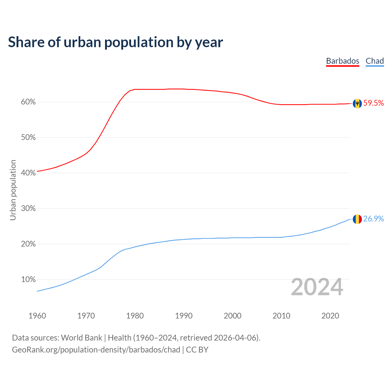 From 2004 to 2024, the share of urban population changed from 61.1% to 59.5% in Barbados and from 21.7% to 26.9% in Chad.