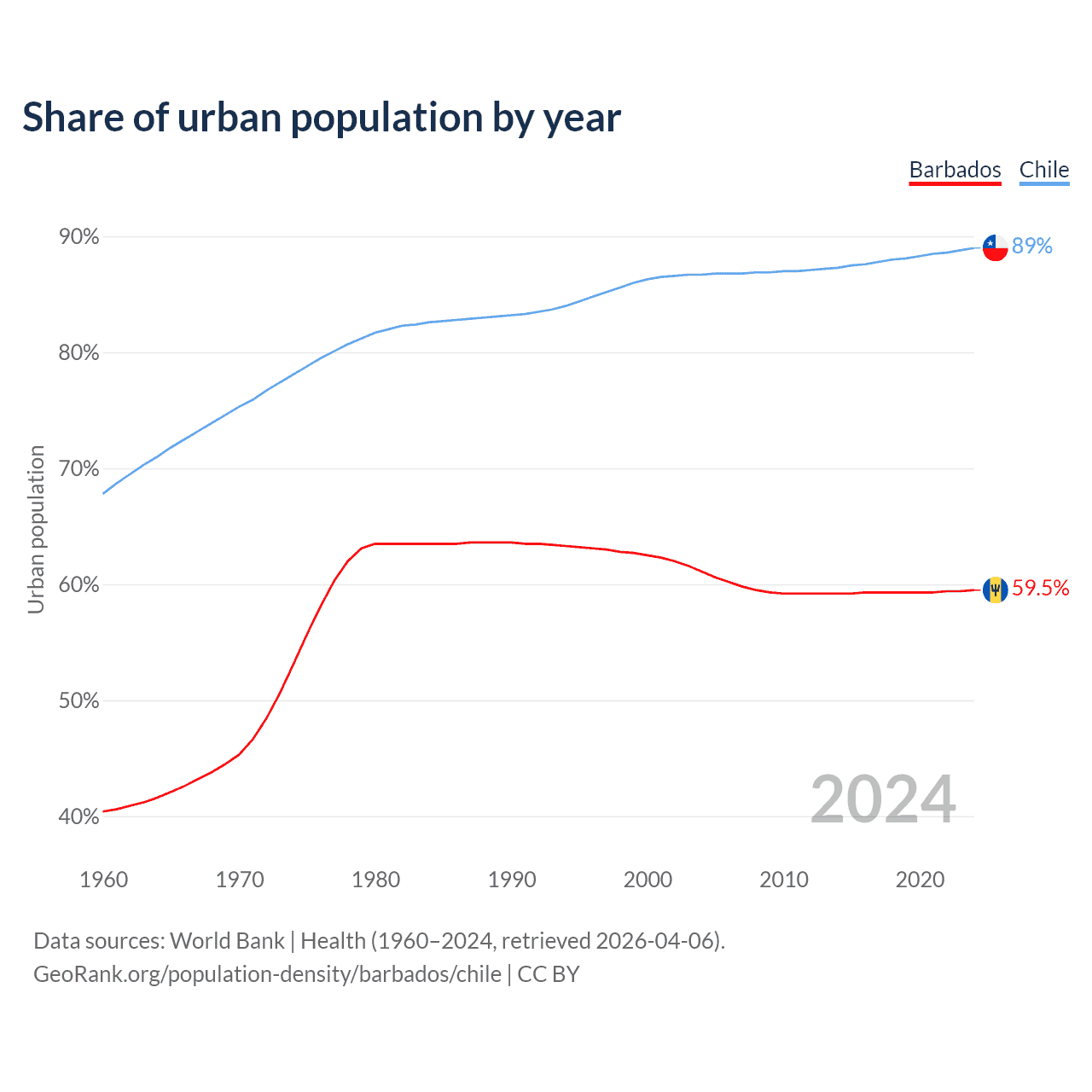 From 2004 to 2024, the share of urban population changed from 61.1% to 59.5% in Barbados and from 86.7% to 89% in Chile.