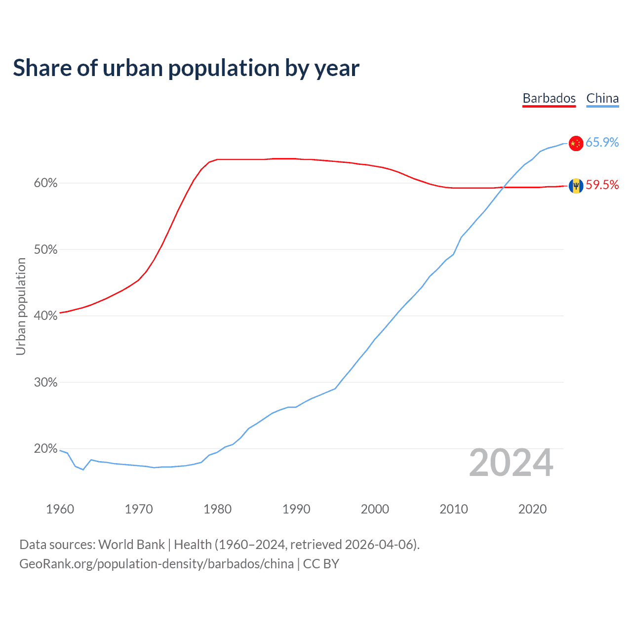 From 2004 to 2024, the share of urban population changed from 61.1% to 59.5% in Barbados and from 41.8% to 65.9% in China.