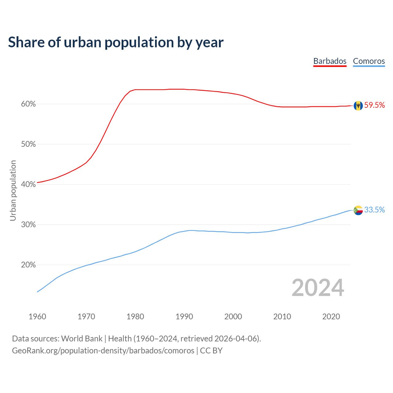 From 2004 to 2024, the share of urban population changed from 61.1% to 59.5% in Barbados and from 28% to 33.5% in Comoros.