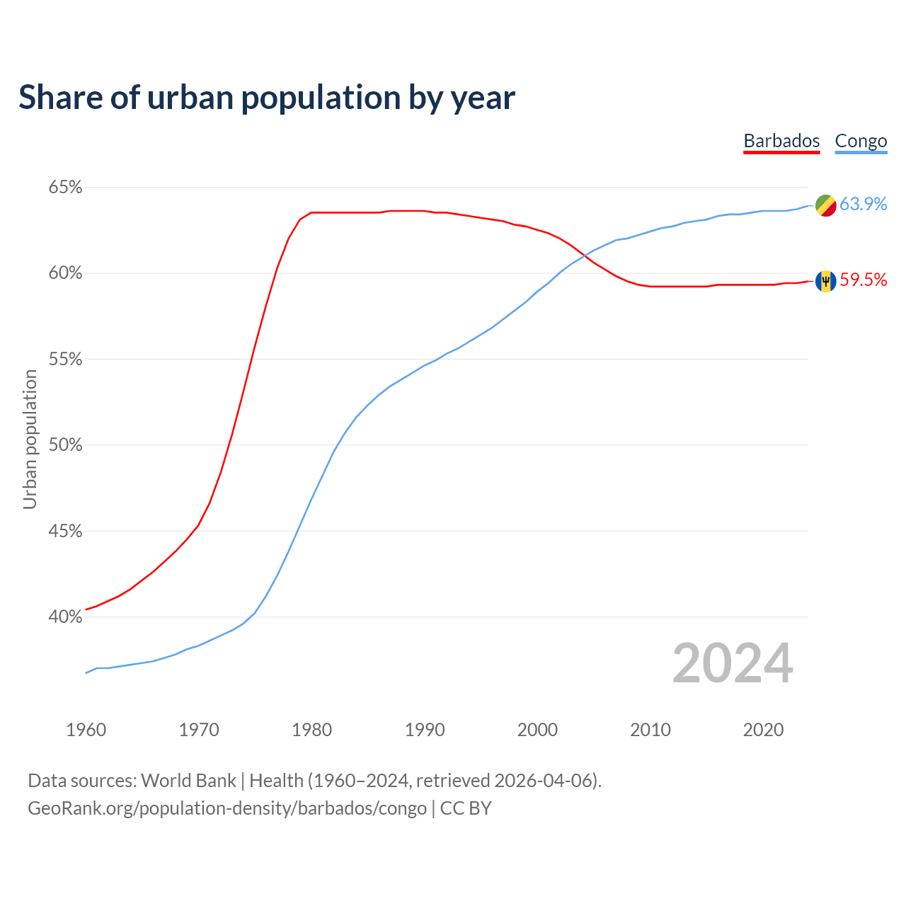 From 2004 to 2024, the share of urban population changed from 61.1% to 59.5% in Barbados and from 60.9% to 63.9% in the Congo.
