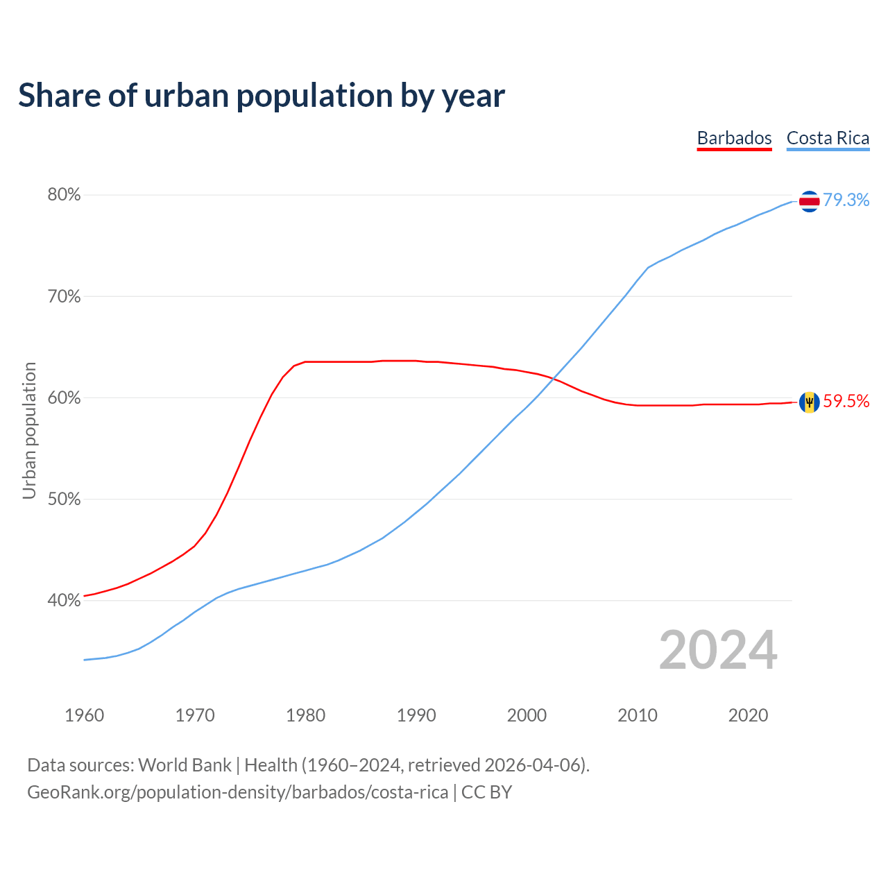 From 2004 to 2024, the share of urban population changed from 61.1% to 59.5% in Barbados and from 63.7% to 79.3% in Costa Rica.