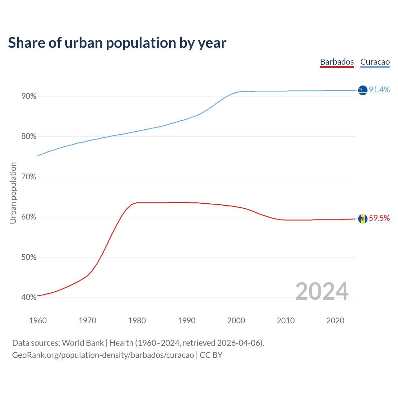 From 2004 to 2024, the share of urban population changed from 61.1% to 59.5% in Barbados and from 91.2% to 91.4% in Curacao.