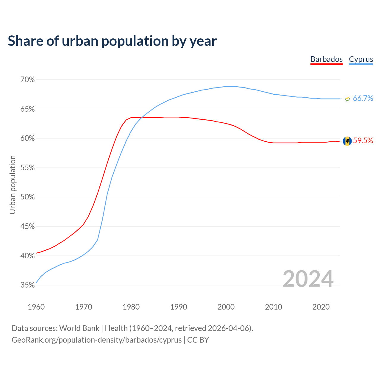 From 2004 to 2024, the share of urban population changed from 61.1% to 59.5% in Barbados and from 68.6% to 66.7% in Cyprus.
