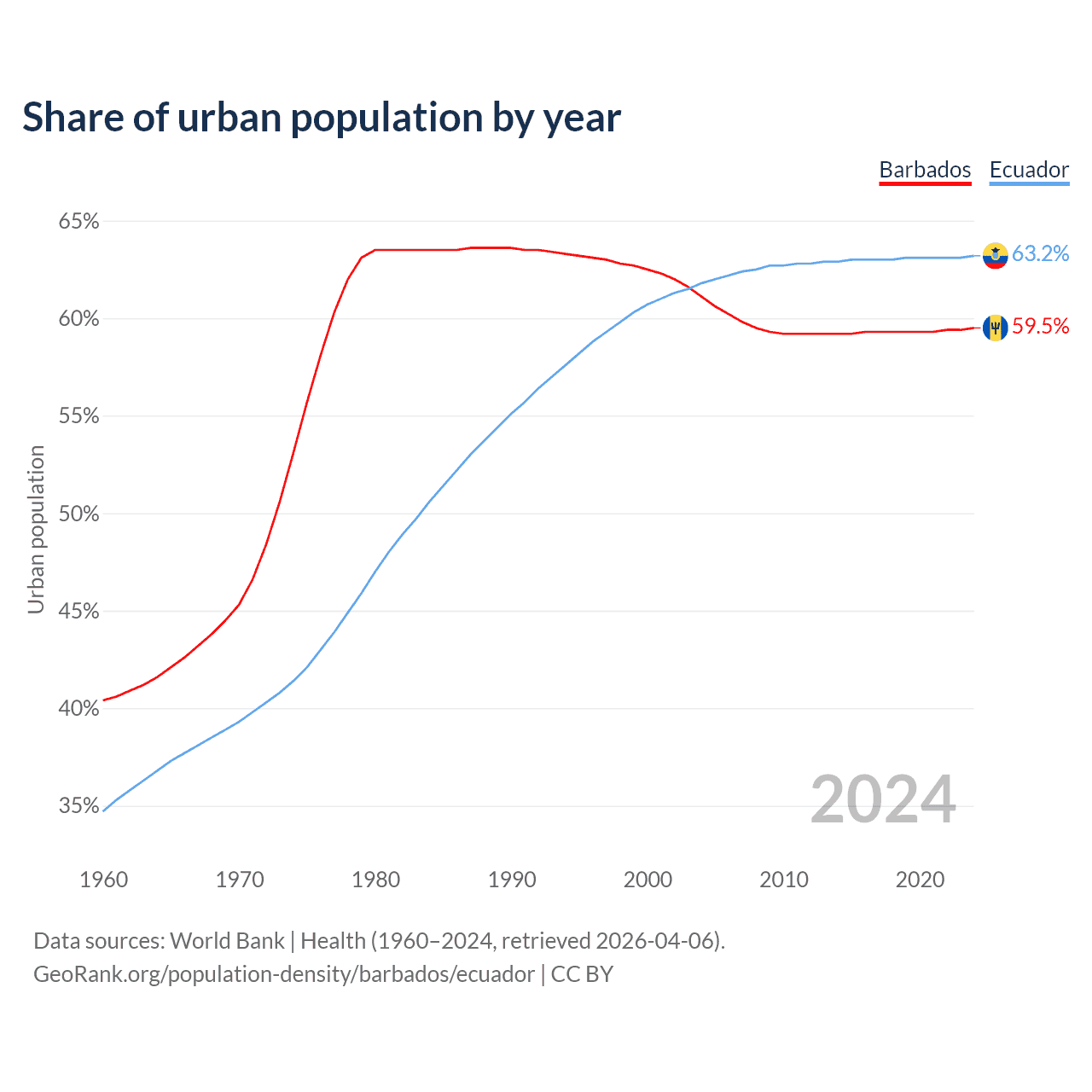 From 2004 to 2024, the share of urban population changed from 61.1% to 59.5% in Barbados and from 61.8% to 63.2% in Ecuador.