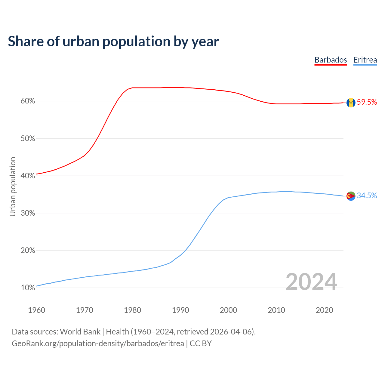 From 2004 to 2024, the share of urban population changed from 61.1% to 59.5% in Barbados and from 34.9% to 34.5% in Eritrea.