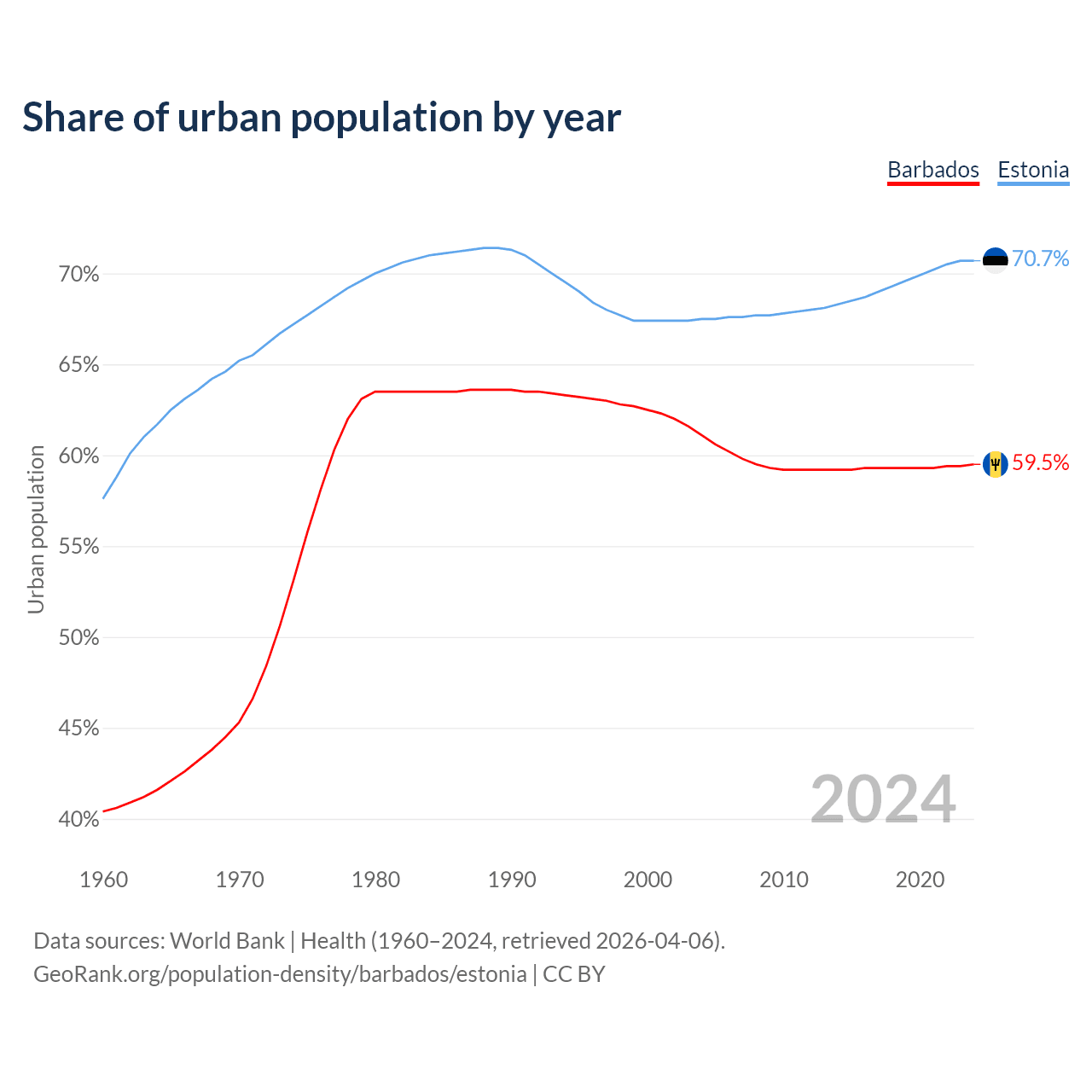 From 2004 to 2024, the share of urban population changed from 61.1% to 59.5% in Barbados and from 67.5% to 70.7% in Estonia.