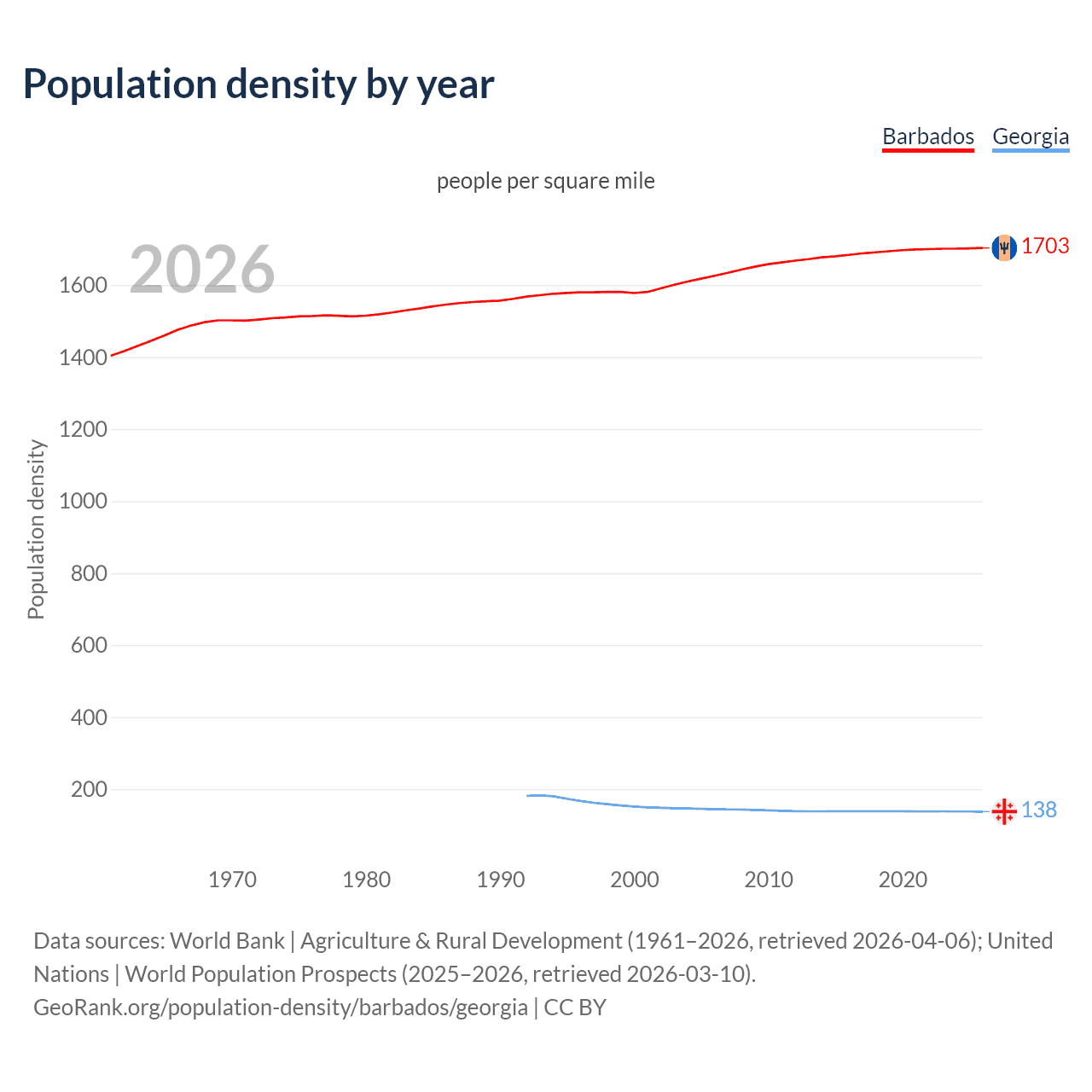 From 2006 to 2026, population density in Barbados increased by 4.73%, compared to a 4.71% decline in Georgia.