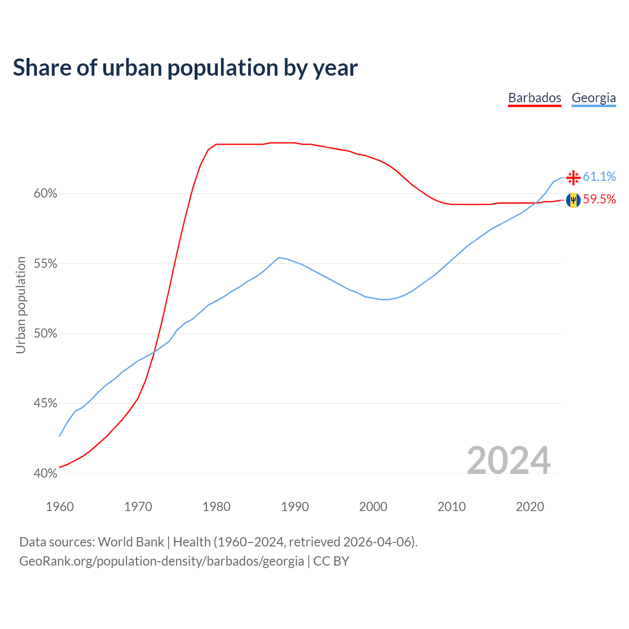 From 2004 to 2024, the share of urban population changed from 61.1% to 59.5% in Barbados and from 52.7% to 61.1% in Georgia.