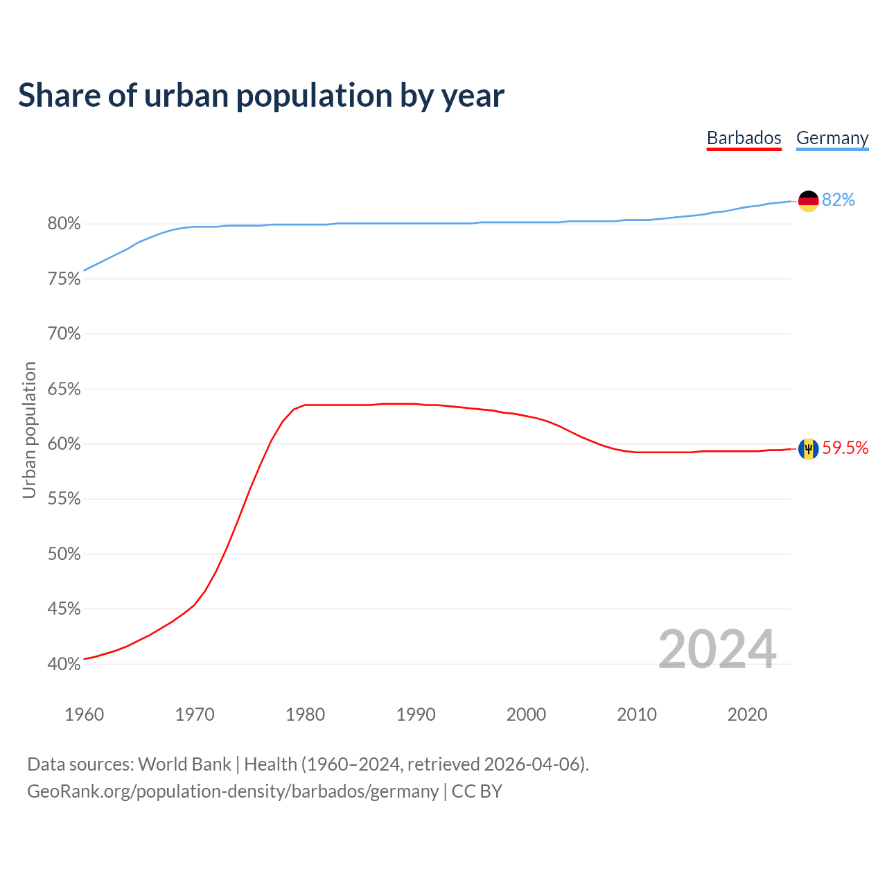 From 2004 to 2024, the share of urban population changed from 61.1% to 59.5% in Barbados and from 80.2% to 82% in Germany.