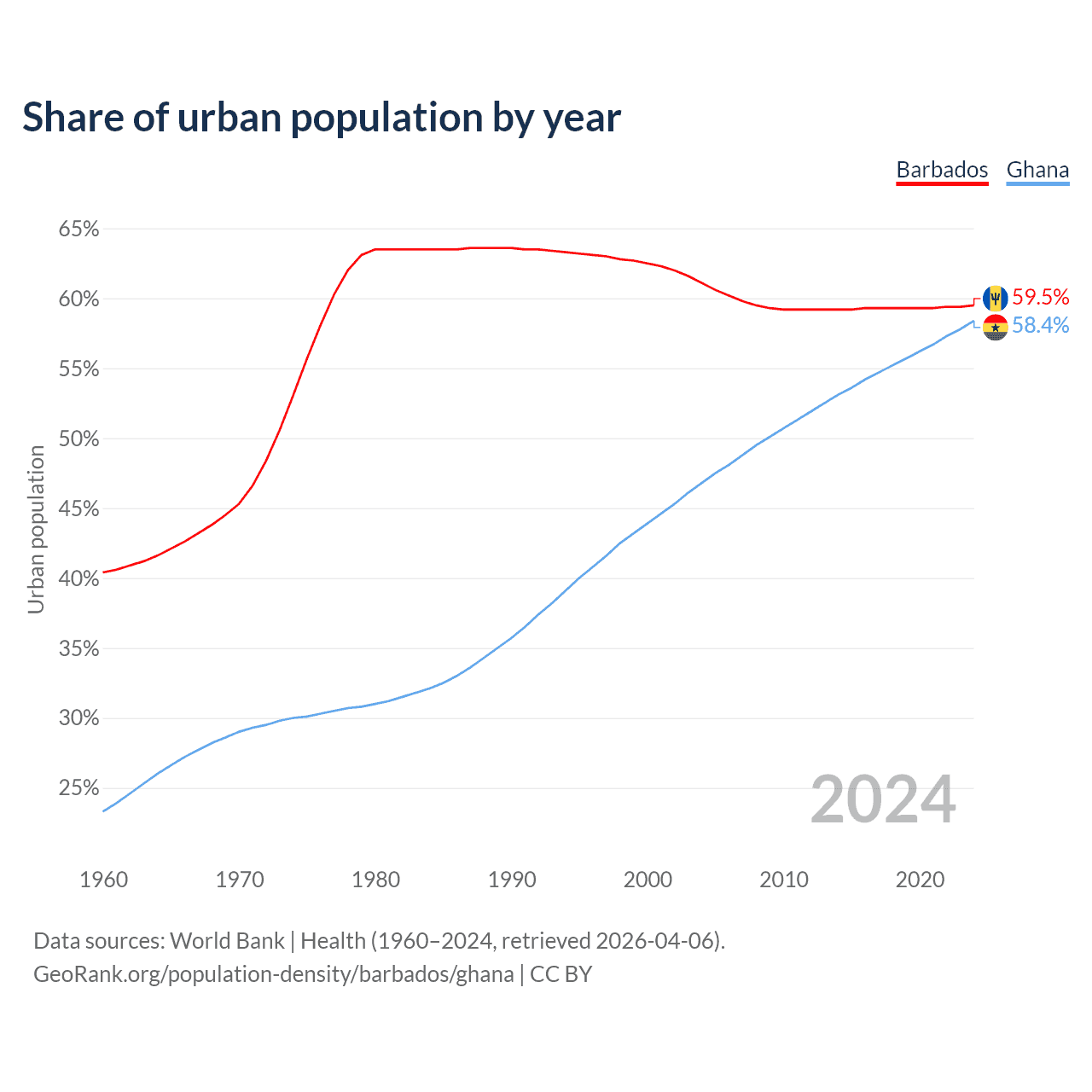 From 2004 to 2024, the share of urban population changed from 61.1% to 59.5% in Barbados and from 46.8% to 58.4% in Ghana.