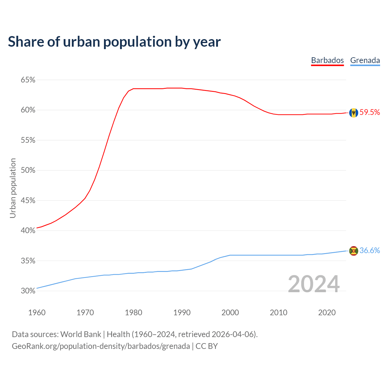 From 2004 to 2024, the share of urban population changed from 61.1% to 59.5% in Barbados and from 35.9% to 36.6% in Grenada.
