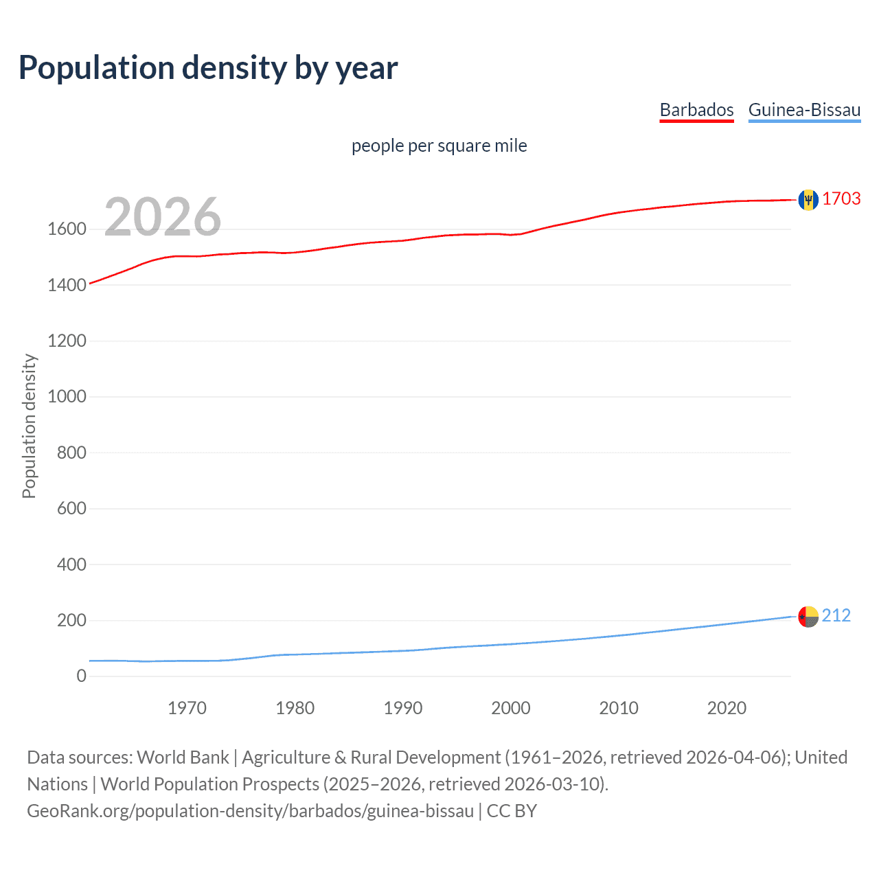 From 2006 to 2026, population density in Barbados increased by 4.73%, compared to a 62.4% growth in Guinea-Bissau.