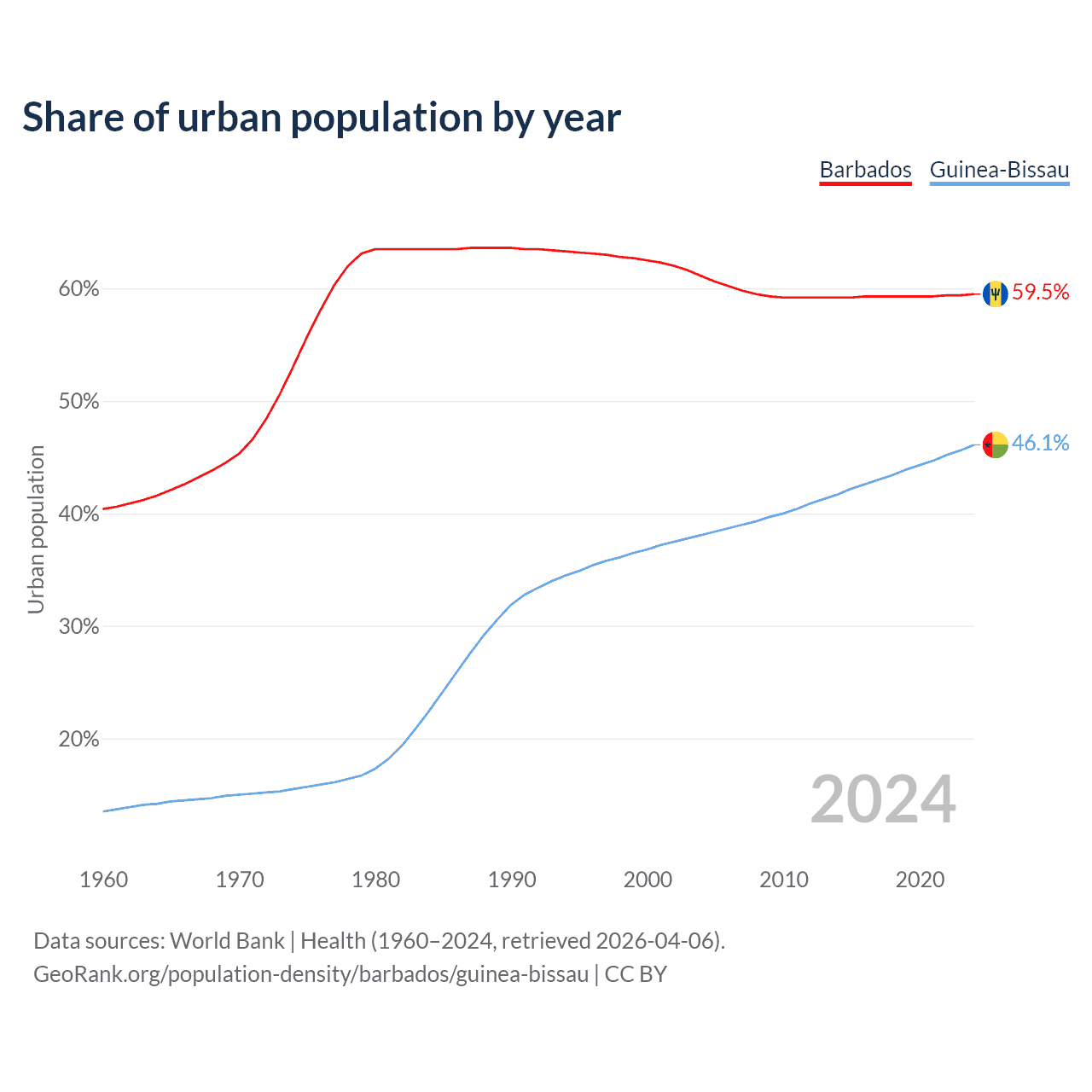 From 2004 to 2024, the share of urban population changed from 61.1% to 59.5% in Barbados and from 38.1% to 46.1% in Guinea-Bissau.