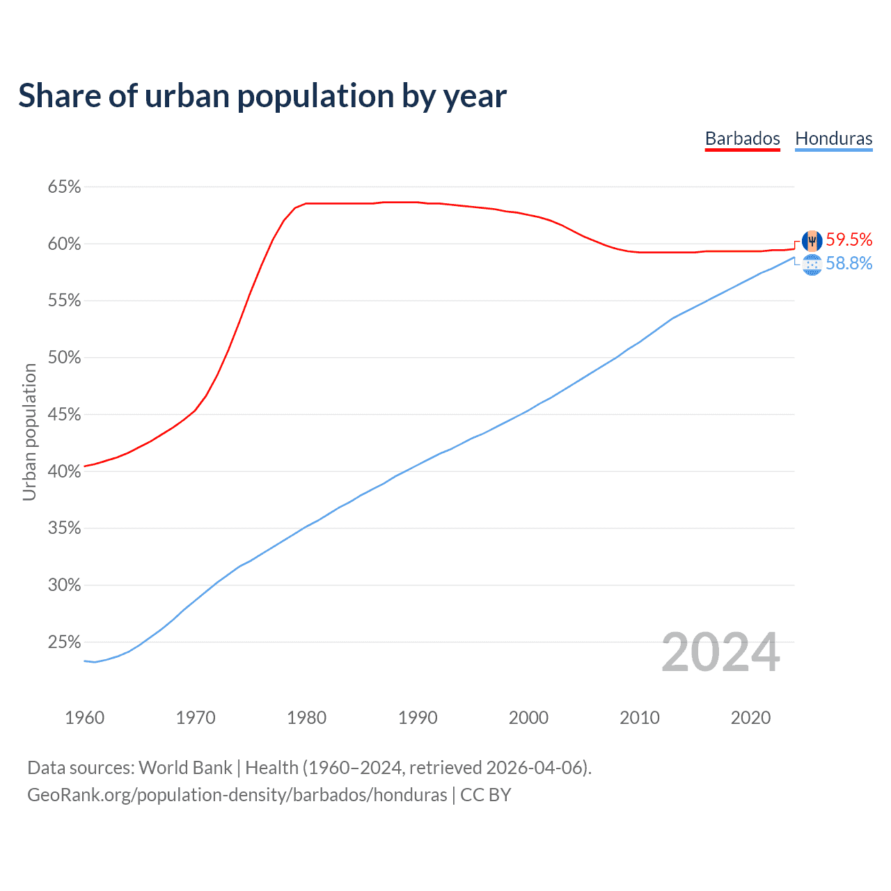From 2004 to 2024, the share of urban population changed from 61.1% to 59.5% in Barbados and from 47.6% to 58.8% in Honduras.