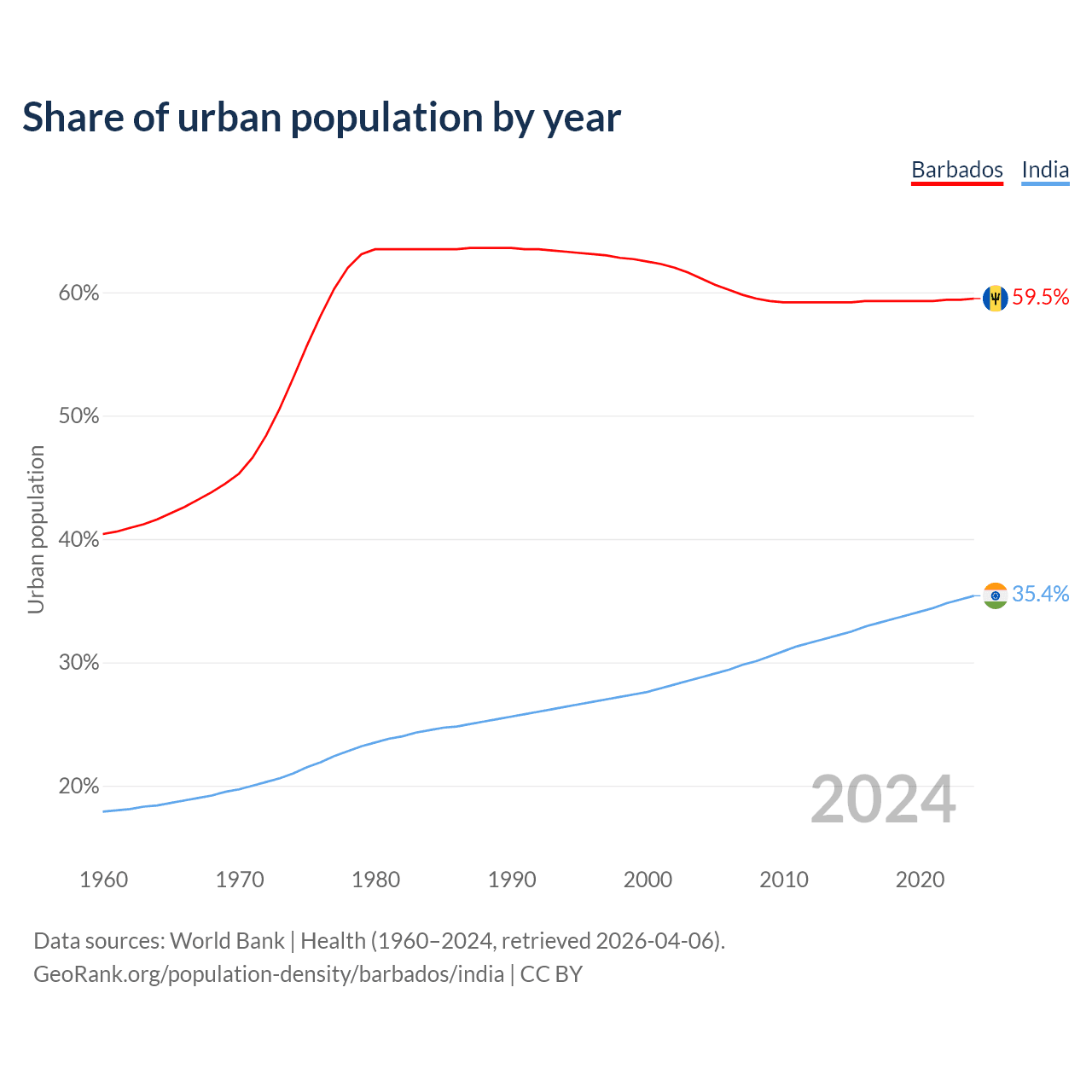 From 2004 to 2024, the share of urban population changed from 61.1% to 59.5% in Barbados and from 28.8% to 35.4% in India.