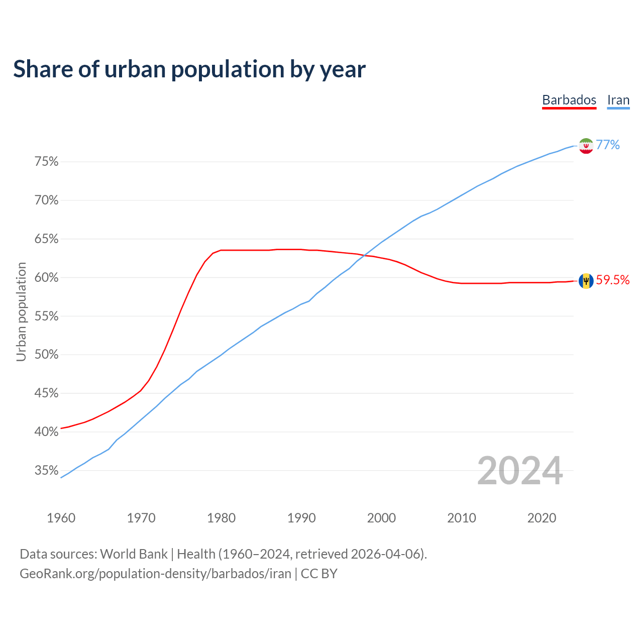 From 2004 to 2024, the share of urban population changed from 61.1% to 59.5% in Barbados and from 67.3% to 77% in Iran.