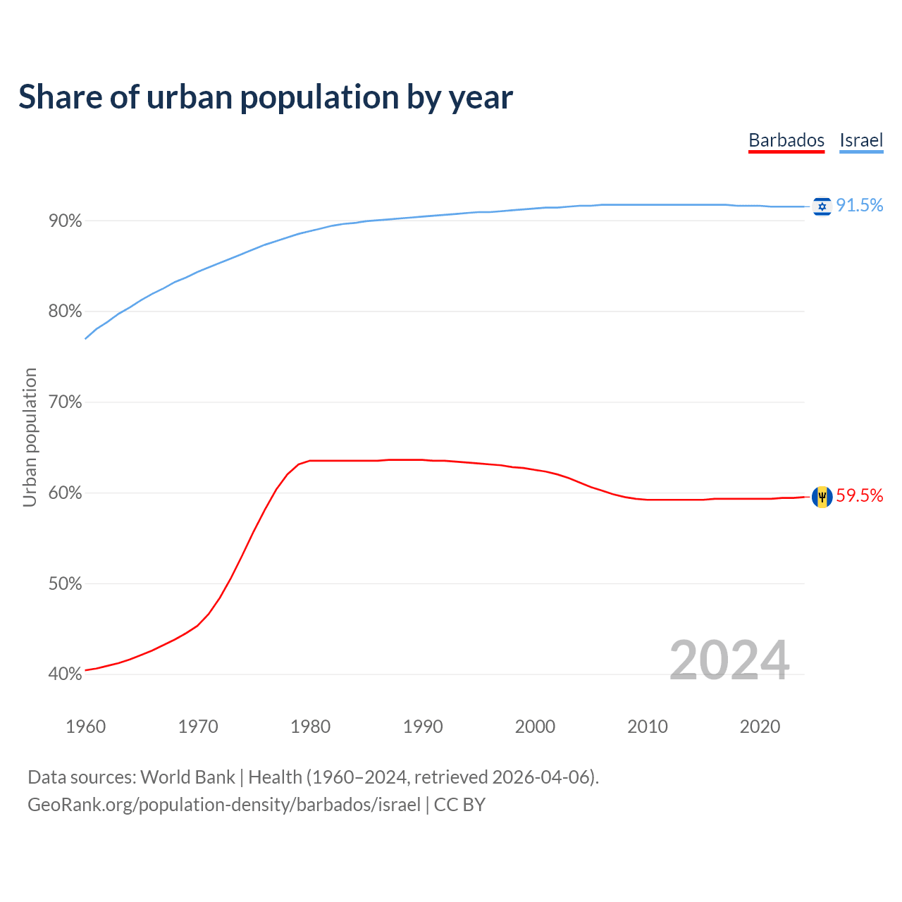 From 2004 to 2024, the share of urban population changed from 61.1% to 59.5% in Barbados and from 91.6% to 91.5% in Israel.