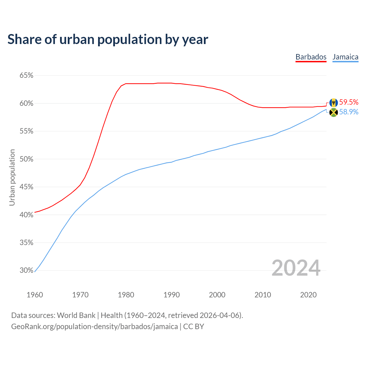From 2004 to 2024, the share of urban population changed from 61.1% to 59.5% in Barbados and from 52.6% to 58.9% in Jamaica.
