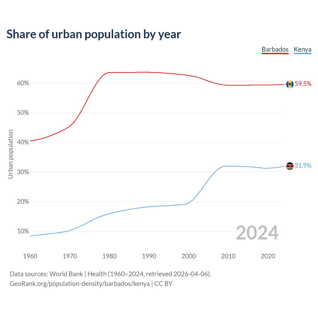 From 2004 to 2024, the share of urban population changed from 61.1% to 59.5% in Barbados and from 25.4% to 31.9% in Kenya.