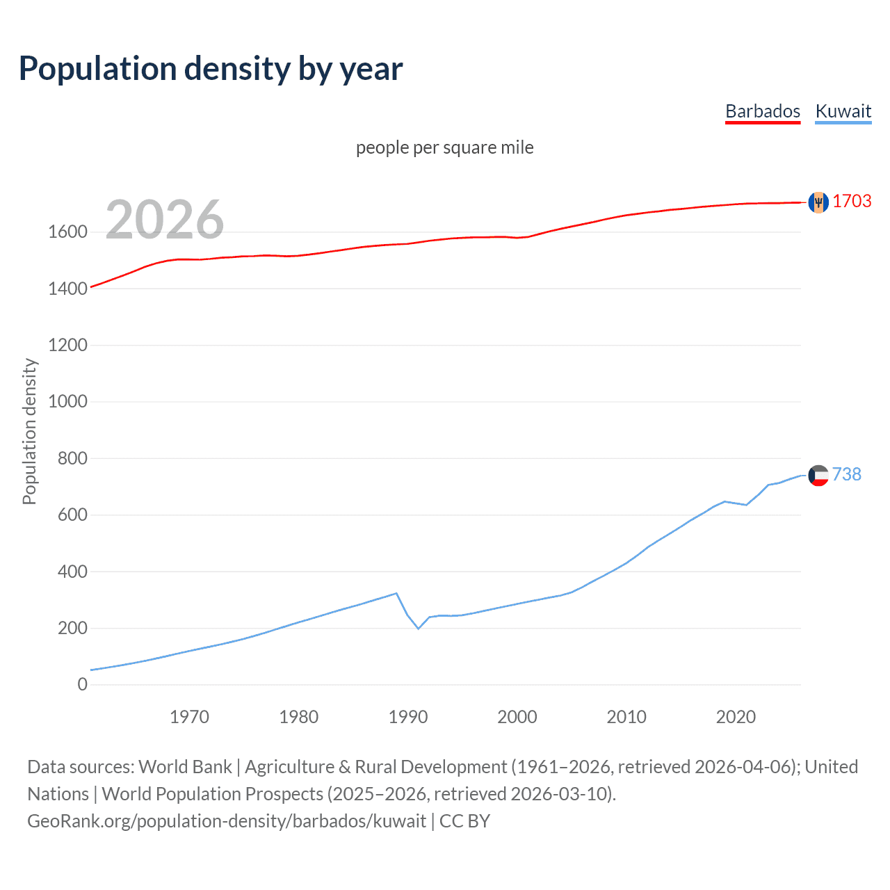 From 2006 to 2026, population density in Barbados increased by 4.73%, compared to a 114.9% growth in Kuwait.