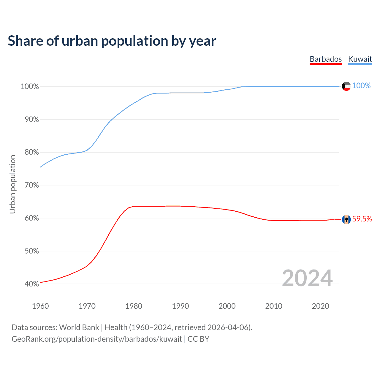 From 2004 to 2024, the share of urban population changed from 61.1% to 59.5% in Barbados and from 99.9% to 100% in Kuwait.