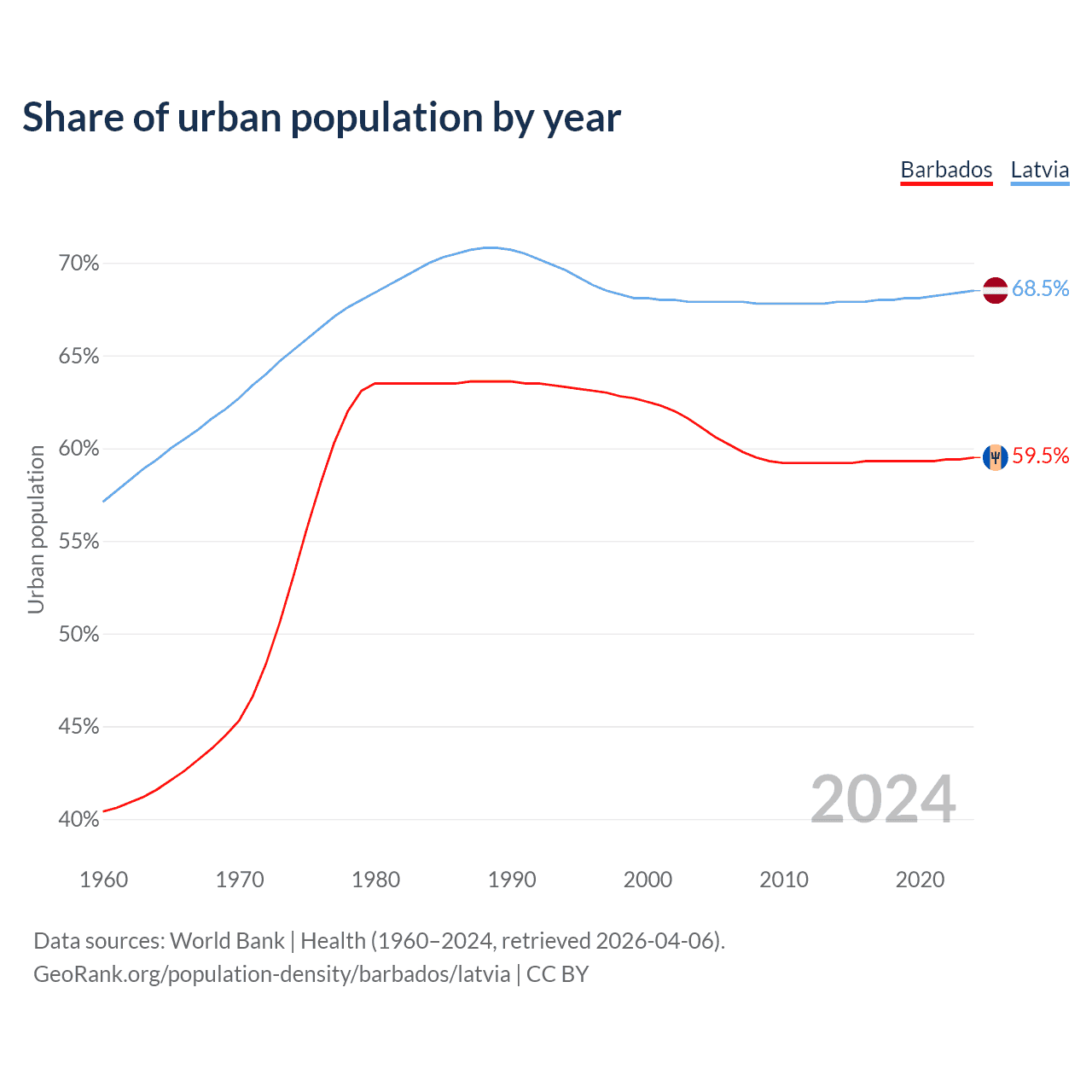 From 2004 to 2024, the share of urban population changed from 61.1% to 59.5% in Barbados and from 67.9% to 68.5% in Latvia.